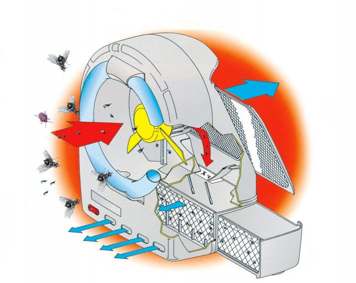 Der einstufige Ventilatormotor hat ausreichend Leistung, um auch größere Insekten einzusaugen. Die Aufstellung sollte, wie bei allen Insektenfallen mit UV-A Lampen als Lockmittel, an dunklen, schattigen Orten erfolgen. Filter und Fangbehälter sind regelmäßig zu reinigen.