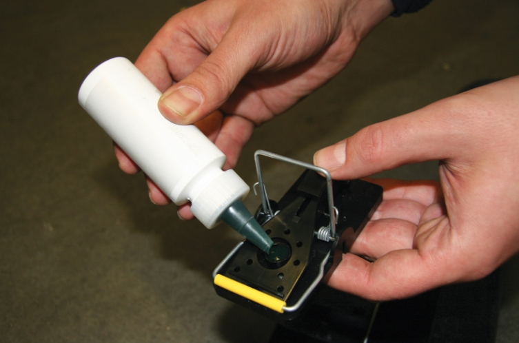 Täglich kontrollieren: Bei Fang: Falle öffnen, Bügel ziehen, Maus hygienisch entsorgen (Einweg-Handschuhe verwenden).
